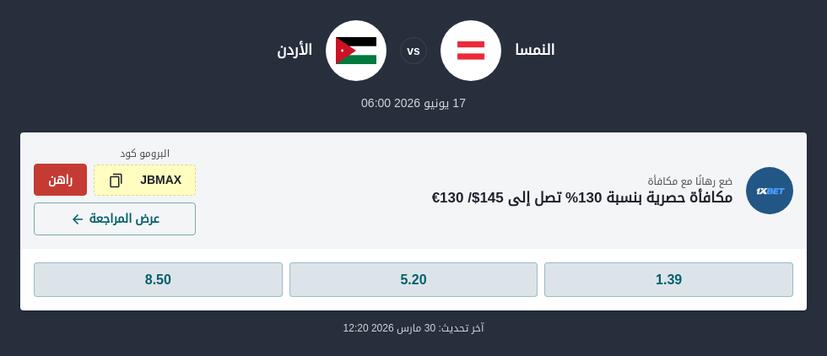 مباراة قوية للنشامى وانتظار لتوقعات مباراة النمسا والأردن ضمن منافسات كأس العالم 2026، والتي تُقام يوم الأربعاء 17 يونيو الساعة 7 صباحًا بتوقيت السعودية في مدينة سان فرانسيسكو. هذه المواجهة تحمل طابعًا تاريخيًا، حيث تعود النمسا إلى المونديال بعد غياب طويل منذ 1998، بينما يسجل المنتخب الأردني ظهوره الأول في البطولة. ورغم أن احتمالات مباراة النمسا والأردن الرسمية حسب 1XBET هي 1.39 للنمسا، 5.2 تعادل، 8.5 للأردن. اليك أبرز توقعات كأس العالم الخاصة بهذه المباراة، مع نظرة معمقة حول الرهان اونلاين على النمسا والاردن وأهم السيناريوهات المتوقعة.