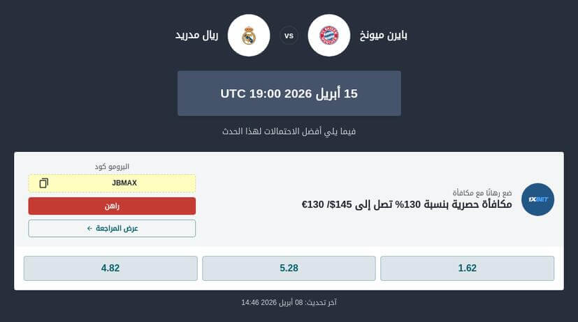 يمكنك الرهان على بايرن ميونخ ضد ريال مدريد عبر مواقع موصى بها من فريق جوني بت مثل 1XBET، MelBet، BetWinner او اكس باري بت رمز اذ تقدم هذه المنصات أفضل احتمالات الرهان على بايرن ميونخ ضد ريال مدريد، إلى جانب عروض الرهان على دوري الابطال وبونصات مميزة تساعدك على تحقيق أقصى استفادة. تأكد دائمًا من مراجعة العروض واختيار الاستراتيجية المناسبة بناءً على تحليل مباراة الاياب بايرن ميونخ ضد ريال مدريد.
