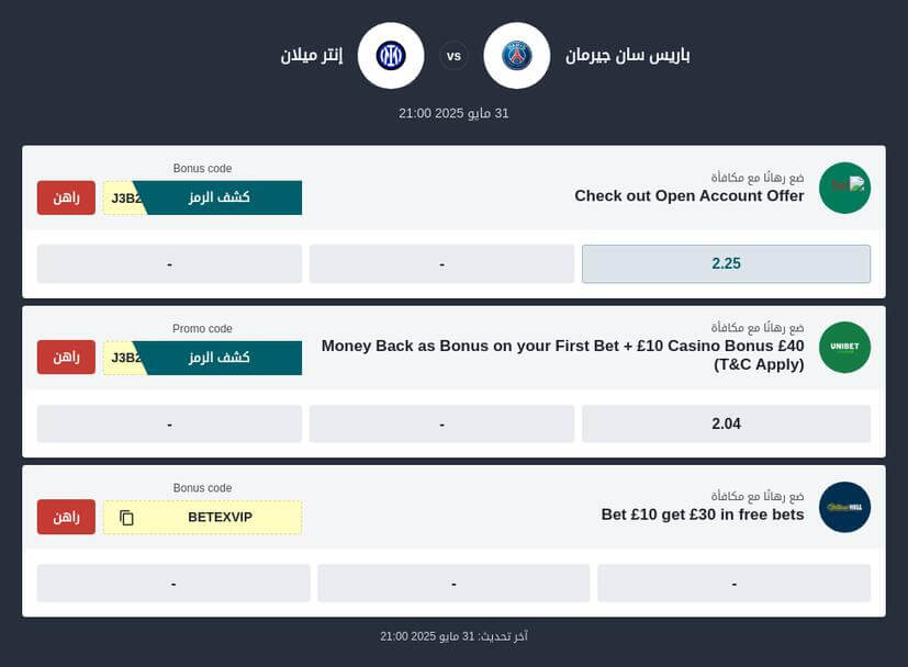 بعد أن بحثت وأصبحت تملك كل ما تحتاج أن تعرفه حول توقعات نهائي دوري أبطال أوروبا 2025، يمكن ان تجرب حظك في أحد مواقع الرهانات وتتوقع الفريق الفائز باللقب.